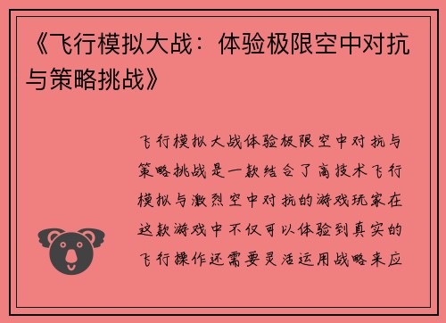 《飞行模拟大战:体验极限空中对抗与策略挑战》