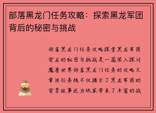 部落黑龙门任务攻略:探索黑龙军团背后的秘密与挑战