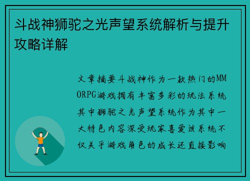 斗战神狮驼之光声望系统解析与提升攻略详解